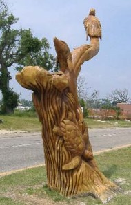Sabbatical leave is over with and I am on my way back from wonderful Louisiana to my pastor life in beautiful Northeast Pennsylvania. Leaving Baton Rouge on Sunday, I spent that day and night in Biloxi, Mississippi with my sis and my mom before going on my way. Dayton Scoggins, chainsaw artist, has made art out of some dead trees along the Gulf Coast down there. In the background are distressed trees bravely leafed out, surrounded by vacant lots that were once (B.K. — Before Katrina) thriving businesses in prime coastal real estate.